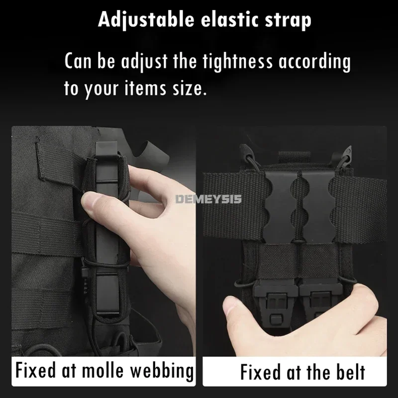 The MOLLE system allows easy attachment to vests, belts, and backpacks.