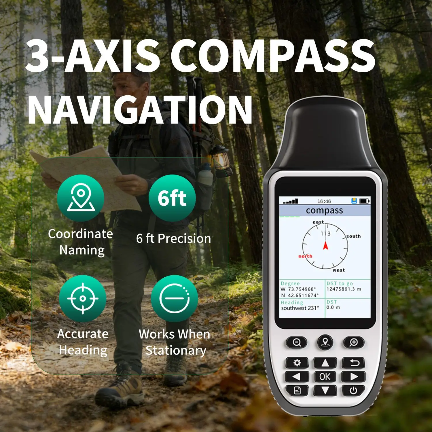 Equipped with a 3-axis compass, it ensures accurate direction tracking even when held at different angles.